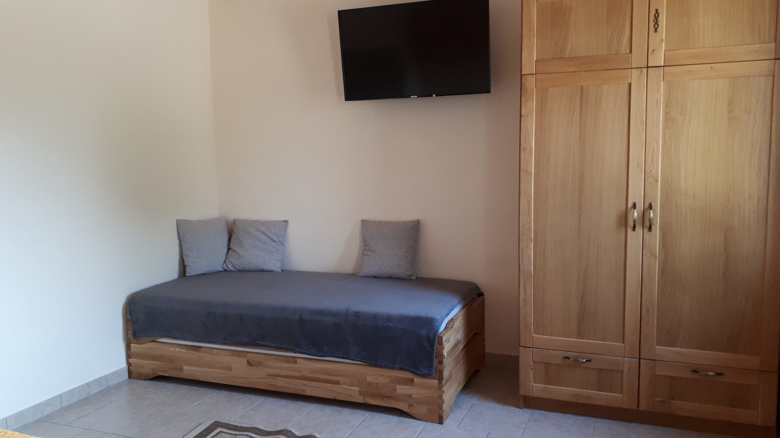 Im Schlafzimmer finden sich ein großes Doppelbett sowie ein bis zwei Einzelbetten und ein Flachbild-TV mit SAT.