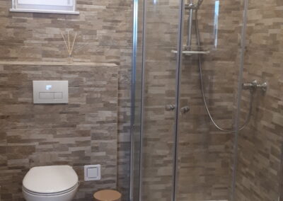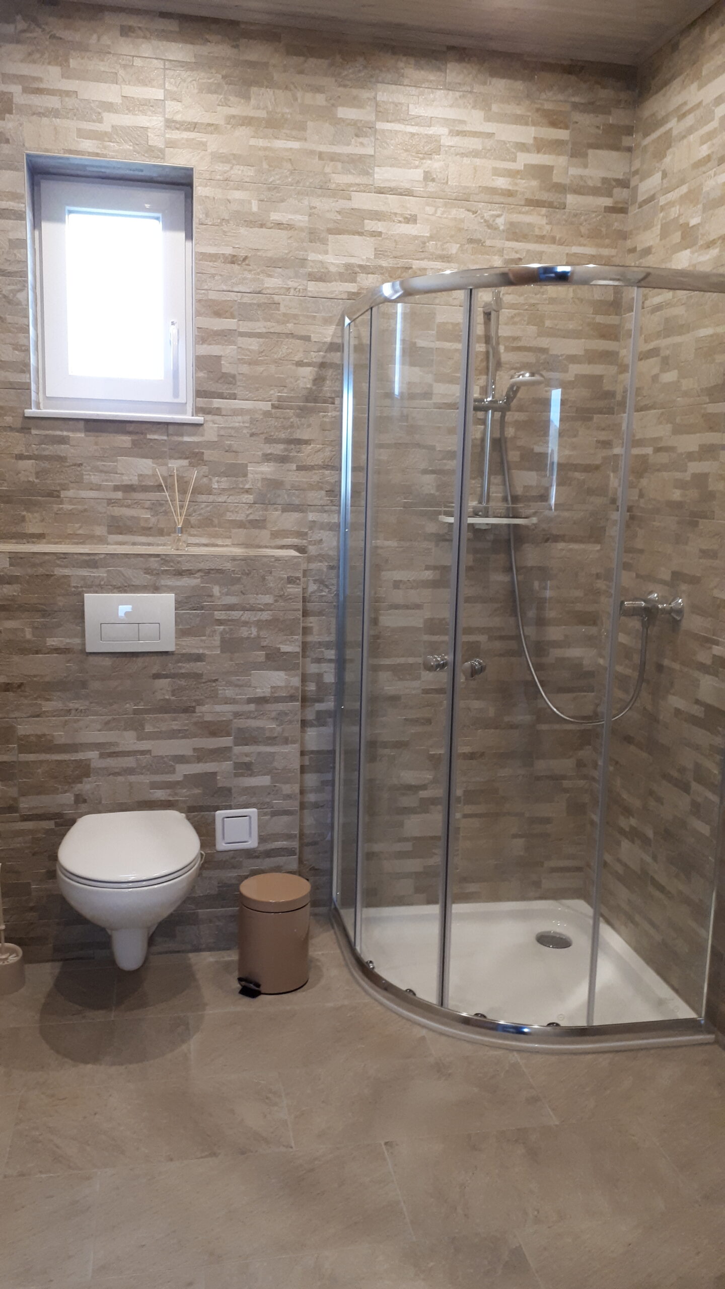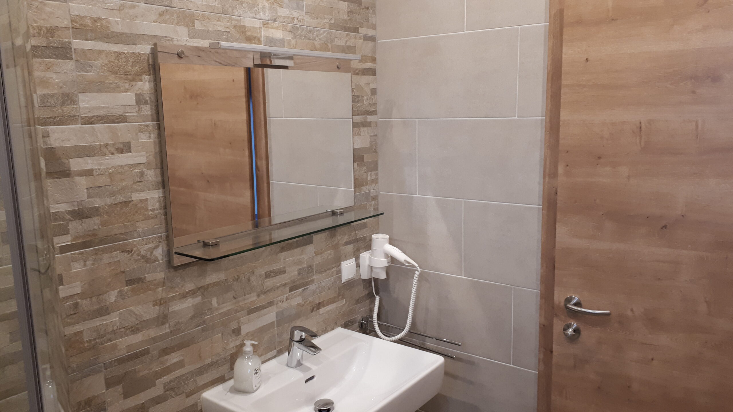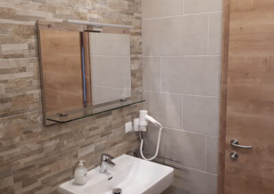 Die Bäder sind alle mit Dusche, WC, Waschbecken und Haarfön ausgestattet und verfügen über Fenster und Fußbodenheizung.
