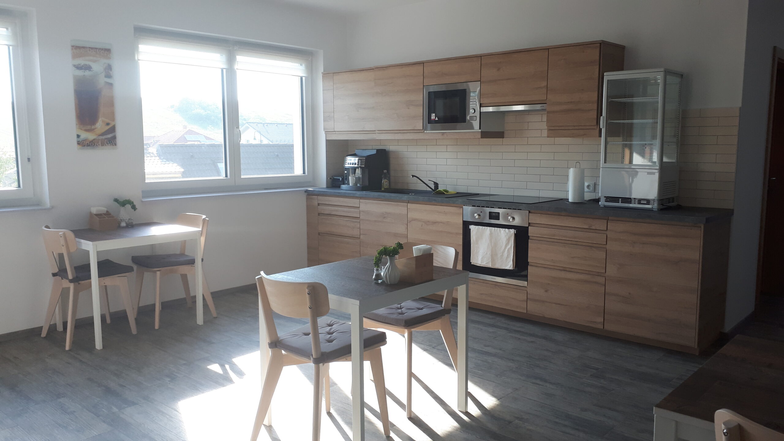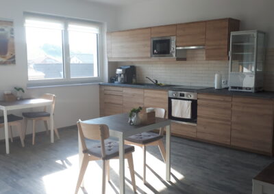 Im großzügigen gemeinsamen Koch- und Essbereich fehlt es an nichts. Eine vollausgestattete Küche mit großer Kühl-Gefrierkombination und überkompletten Küchengeräten ist besonders für Monteurpartien sehr attraktiv.